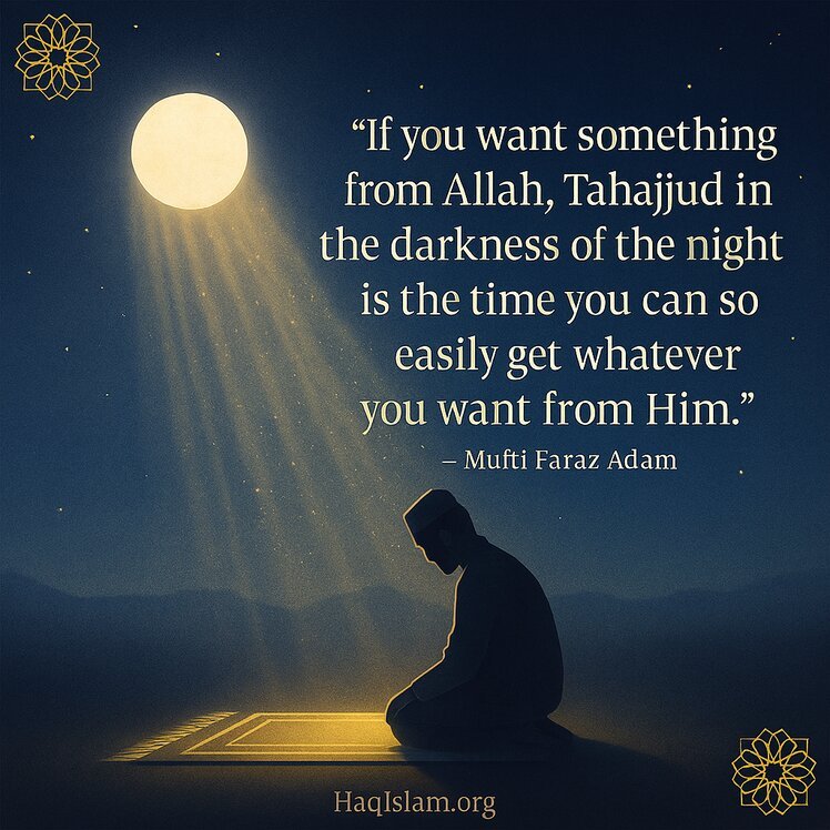 July 2, 2024 Ahmed Quote Leave a comment Do you want something from Allah? If you want something from Allah, Tahajjud in the darkness of the night is the time you can so easily get whatever you want from Him.Mufti Faraz Adam Share this: Click to share on Bluesky (Opens in new window) Bluesky Click to share on Facebook (Opens in new window) Facebook Click to share on X (Opens in new window) X Click to share on Tumblr (Opens in new window) Tumblr Click to share on Pinterest (Opens in new window) Pinterest Click to share on Mastodon (Opens in new window) Mastodon Click to share on Telegram (Opens in new window) Telegram Click to share on WhatsApp (Opens in new window) WhatsApp Click to share on LinkedIn (Opens in new window) LinkedIn More Click to share on Reddit (Opens in new window) Reddit Click to share on Threads (Opens in new window) Threads Click to share on Nextdoor (Opens in new window) Nextdoor Talk with AllahDateMay 2, 2008In relation toQuoteAllahDateJanuary 13, 2011In relation toAllahAllah the ProviderDateFebruary 3, 2011In relation toStories of the Pious AllahQuotes