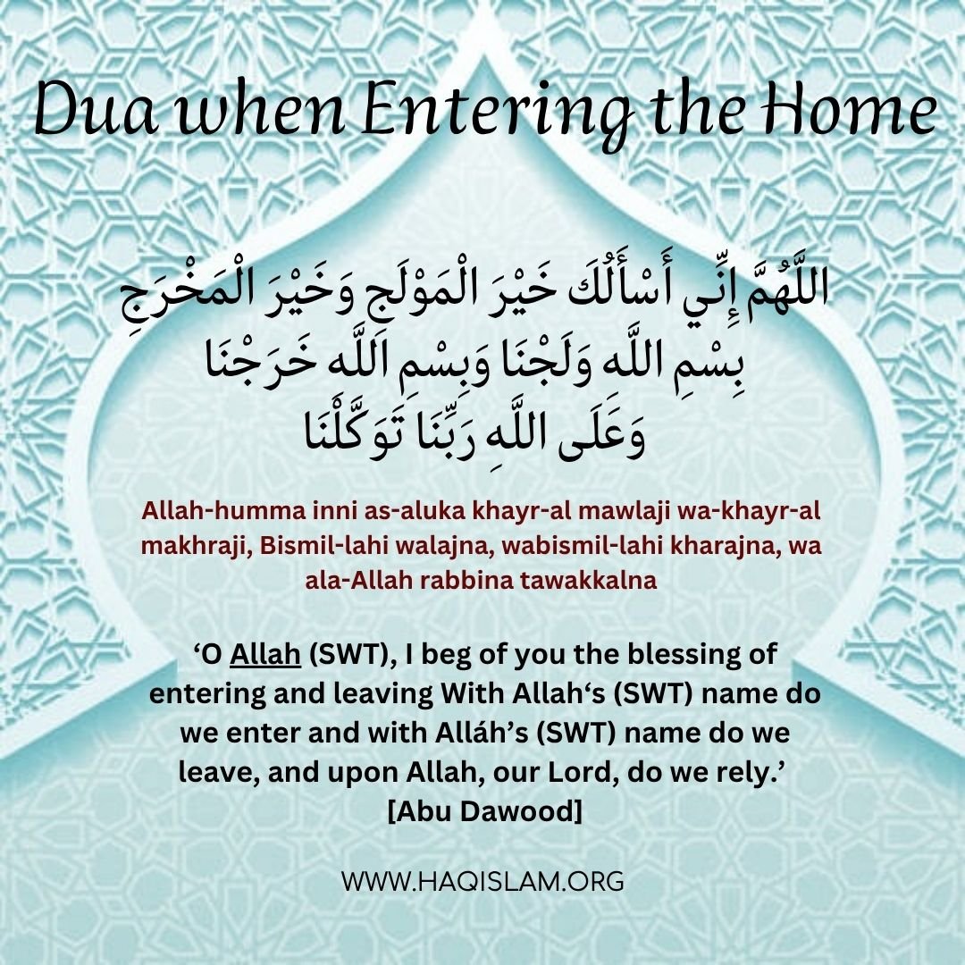 O Allah (SWT), I beg of you the blessing of entering and leaving With Allah‘s (SWT) name do we enter and with Alláh’s (SWT) name do we leave, and upon Allah, our Lord, do we rely.
