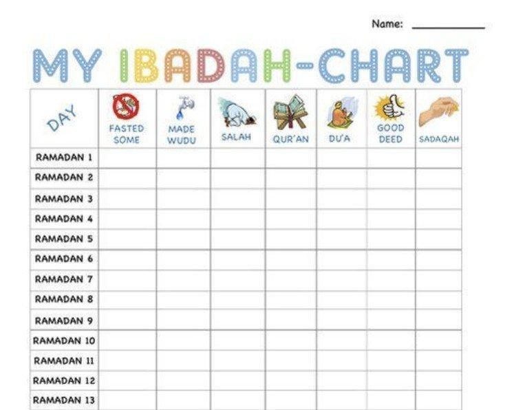 Ramadan is a great time to help children build good islamic habits and strengthen their imaan and connection with Allah. This Ibadah chart for kids in Ramadan can be used to motivate kids to pray salaah, read Qur’an, give charity and other good deeds each day. Print off this sheet and complete with your child to embed good behaviour and habits in the blessed month of Ramadan.