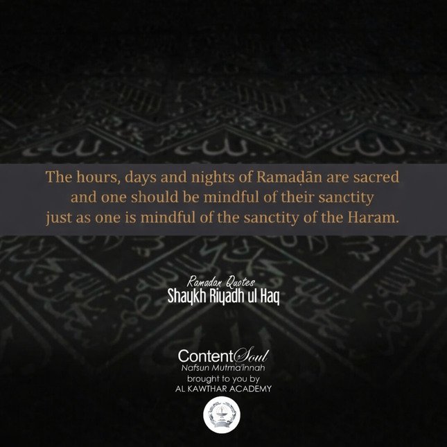 May 9, 2019 Ahmed Ramadan Quotes Leave a comment Sacredness of Ramadan “The hours, days and nights of Ramaḍān are sacred and one should be mindful of their sanctity just as one is mindful of the sanctity of the Haram.” Shaykh Riyadh ul Haq #Ramadan #Ramadanquotes Ramadan Quotes Share this: Share on Bluesky (Opens in new window) Bluesky Share on Facebook (Opens in new window) Facebook Share on X (Opens in new window) X Share on Tumblr (Opens in new window) Tumblr Share on Pinterest (Opens in new window) Pinterest Share on Mastodon (Opens in new window) Mastodon Share on Telegram (Opens in new window) Telegram Share on WhatsApp (Opens in new window) WhatsApp Share on LinkedIn (Opens in new window) LinkedIn More Share on Reddit (Opens in new window) Reddit Share on Threads (Opens in new window) Threads Share on Nextdoor (Opens in new window) Nextdoor Training for the yearDateMay 20, 2019In relation toRamadan QuotesDo not argueDateMay 16, 2019In relation toRamadan QuotesMeaning of I’tikafDateMay 28, 2019In relation toRamadan Quotes QuotesRamadan