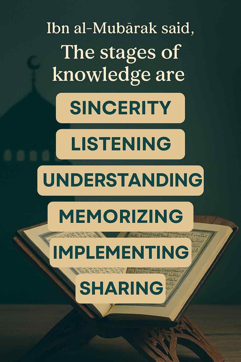 Ibn al-Mubārak said, “The stages of knowledge are sincerity, listening, understanding, memorizing, implementing, and sharing.”