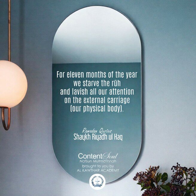 May 11, 2019 Ahmed Ramadan Quotes Leave a comment Starving the ruh “For eleven months of the year we starve the rūḥ (soul) and lavish all our attention on the external carriage (our physical body).” Shaykh Riyadh ul Haq #Ramadanquotes #Ramadan Ramadan Quotes Share this: Share on Bluesky (Opens in new window) Bluesky Share on Facebook (Opens in new window) Facebook Share on X (Opens in new window) X Share on Tumblr (Opens in new window) Tumblr Share on Pinterest (Opens in new window) Pinterest Share on Mastodon (Opens in new window) Mastodon Share on Telegram (Opens in new window) Telegram Share on WhatsApp (Opens in new window) WhatsApp Share on LinkedIn (Opens in new window) LinkedIn More Share on Reddit (Opens in new window) Reddit Share on Threads (Opens in new window) Threads Share on Nextdoor (Opens in new window) Nextdoor Like this:Like Loading... Related QuotesRamadan