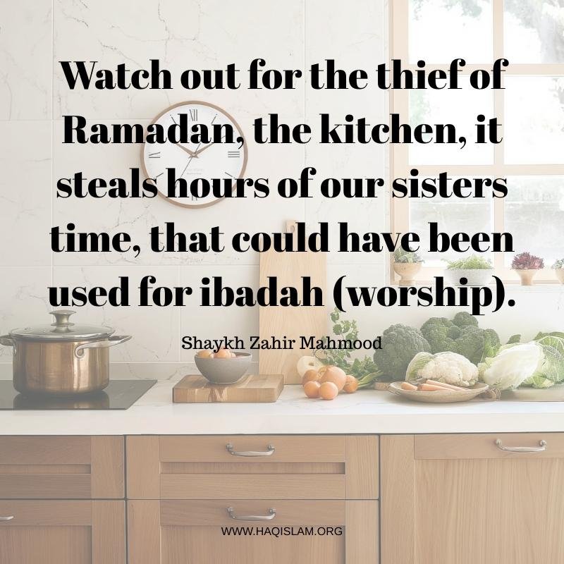 Watch out for the thief of Ramadan, the kitchen, it steals hours of our sisters time, that could have been used for ibadah (worship).