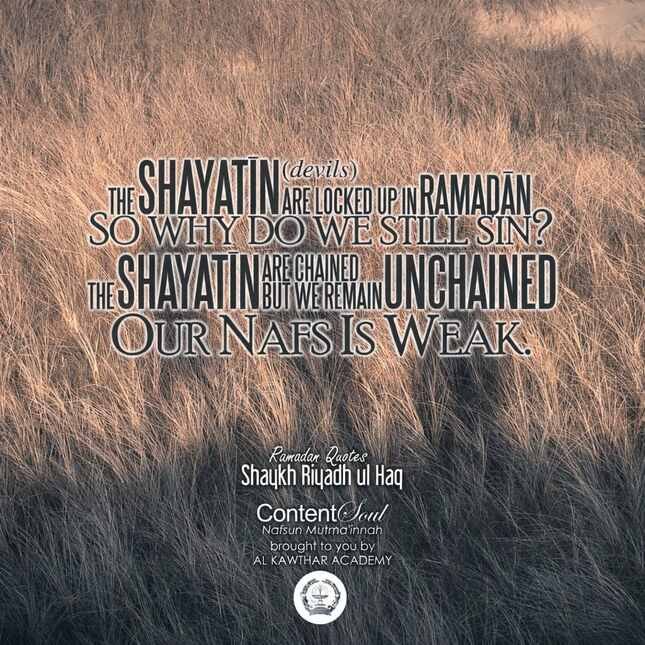 May 29, 2019 Ahmed Ramadan Quotes Leave a comment Weak Nafs “The shayatīn (devils) are locked up in Ramaḍān so why do we still sin? The shayatīn are chained but we remain unchained – our nafs is weak.” Shaykh Riyadh ul Haq Ramadan Quotes Share this: Share on Bluesky (Opens in new window) Bluesky Share on Facebook (Opens in new window) Facebook Share on X (Opens in new window) X Share on Tumblr (Opens in new window) Tumblr Share on Pinterest (Opens in new window) Pinterest Share on Mastodon (Opens in new window) Mastodon Share on Telegram (Opens in new window) Telegram Share on WhatsApp (Opens in new window) WhatsApp Share on LinkedIn (Opens in new window) LinkedIn More Share on Reddit (Opens in new window) Reddit Share on Threads (Opens in new window) Threads Share on Nextdoor (Opens in new window) Nextdoor Like this:Like Loading... Related QuotesRamadan